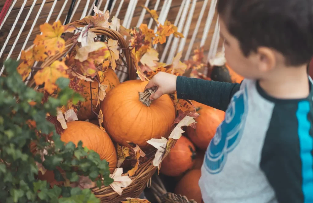- Sous le porche d’entrée : En creusant les entrailles de vos fruits et légumes, créez des paniers garnis ! Rendez-les comestibles en y cachant à l’intérieur des bonbons locaux, fruits de saison, … ou laissez-les en simple décoration, composés de paille, branches, feuilles, …
