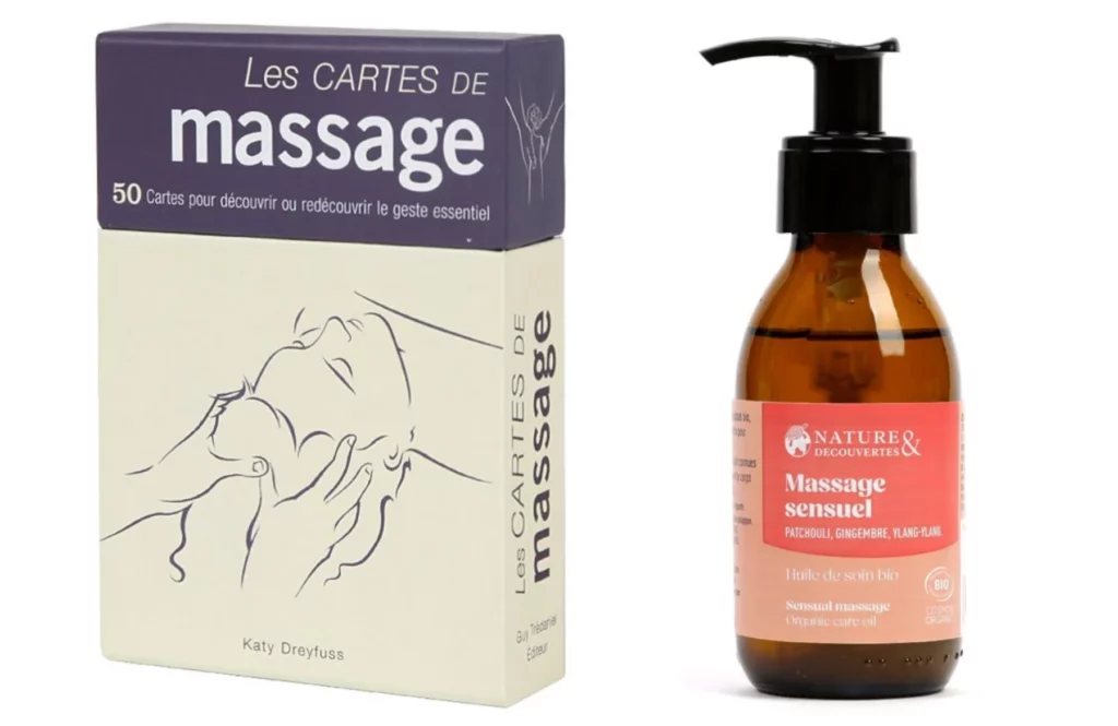 Nature & Découvertes propose plusieurs coffrets bien-être, comme le coffret massage de la tête aux pieds ou les cartes de massage, à compléter avec une huile de massage sensuelle. De quoi transformer une simple soirée en véritable rituel de détente.