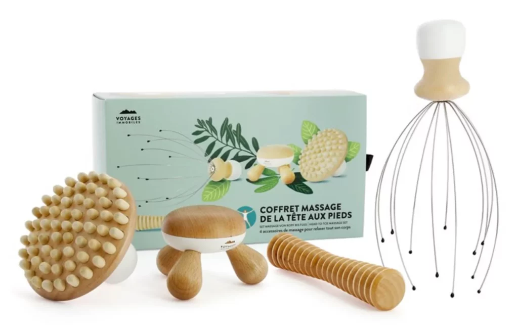 Un coffret de 4 accessoires de massage à utiliser pour détendre votre partenaire des pieds à la tête (prix : 29,95€).